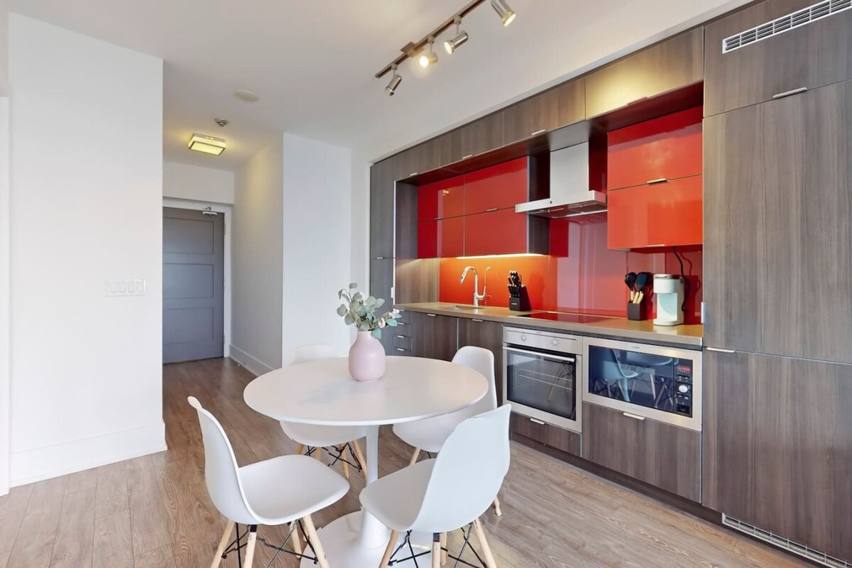 Verið velkomin í Fort York Flat! Þetta 2 svefnherbergi, 1 baðherbergi hefur verið úthugsað með blöndu af nútímalegum og nútímalegum innréttingum til að skapa afslappandi og vandaðan stað til að slaka á meðan þú nýtur alls þess sem miðbær Toronto hefur upp á að bjóða. Staðsetning okkar og snjalla lyklabox staðsett við útidyrnar gerir það að verkum að það er auðveldara að innrita sig í íbúðina en nokkru sinni fyrr. Þú þarft ekki að hafa áhyggjur af því að vesenast með starfsfólk móttökunnar eða bíða eftir lyftum.