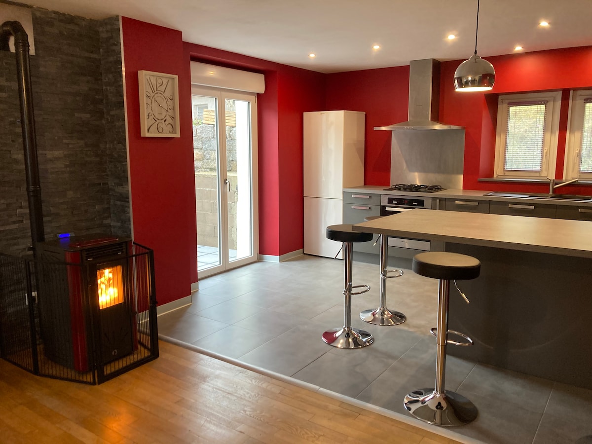 Chalet house Dreifðu yfir 2 stig: - á aðalhæðinni ertu með opið eldhús með stórkostlegu útsýni yfir fjöllin og þorpið, stofu með pelaeldavél og sófa, útiaðgengi að verönd og garði. - uppi, svefnherbergi með 140 x 200 rúmi, svefnherbergi með 2 rúmum 90 x 190, baðherbergi (þar á meðal vaskur, sturta, salerni) Herbergin eru með rafmagns hlerum. Bústaðurinn er reyklaus. Engin gæludýr leyfð.