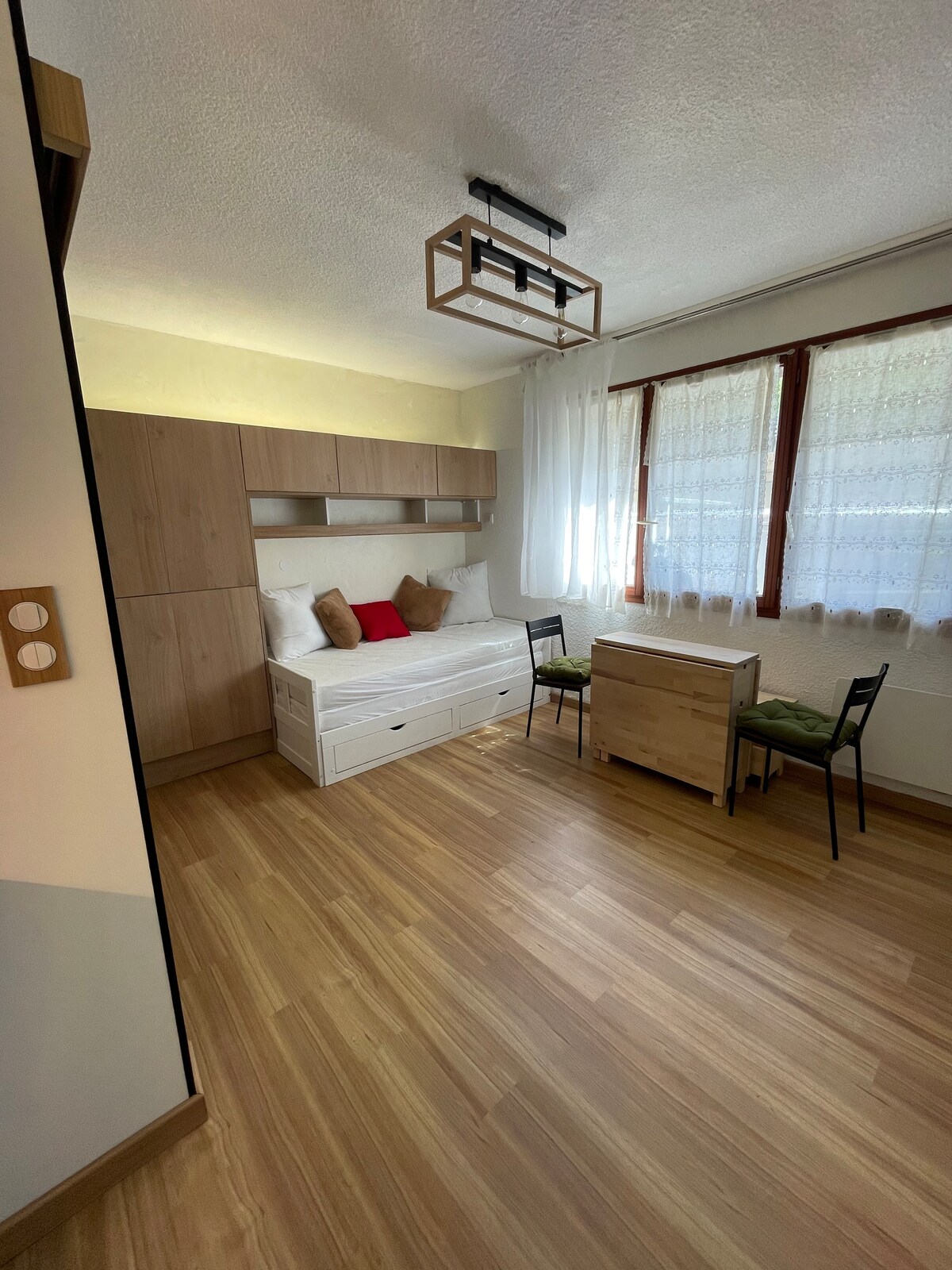 Lítið stúdíó nýlega endurbætt á þriðju hæð í miðbæ Embrun. Loftkæling. Lítil lofthæð. Búin með svölum til að sjá fjöllin í kring. Fyrir tvo einstaklinga með mjög þægilegan breytanlegan sófa. Rafmagnsrúlluhleri og myrkvun blindur fyrir Velux. Ókeypis bílastæði í nágrenninu. Við útvegum handklæði og rúmföt. Síukaffivél er til ráðstöfunar ásamt kaffipakka.