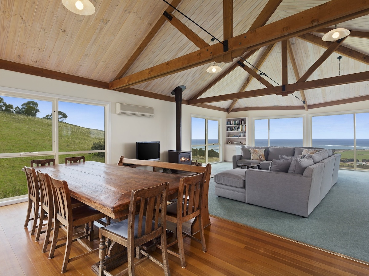 Perched high in the Otways, just 5 mins from Skenes Creek beach (great surfing) and 11 mins from Apollo Bay, The Eyrie is a beautiful property with two split-level homes overlooking the Southern Ocean, with waterfalls, walks, rainforest and views at every turn. There are two houses on the property, both recently redecorated and refurnished, and I hope you'll love them! ** you can find the other house by googling 'Eyrie Skenes Creek' **