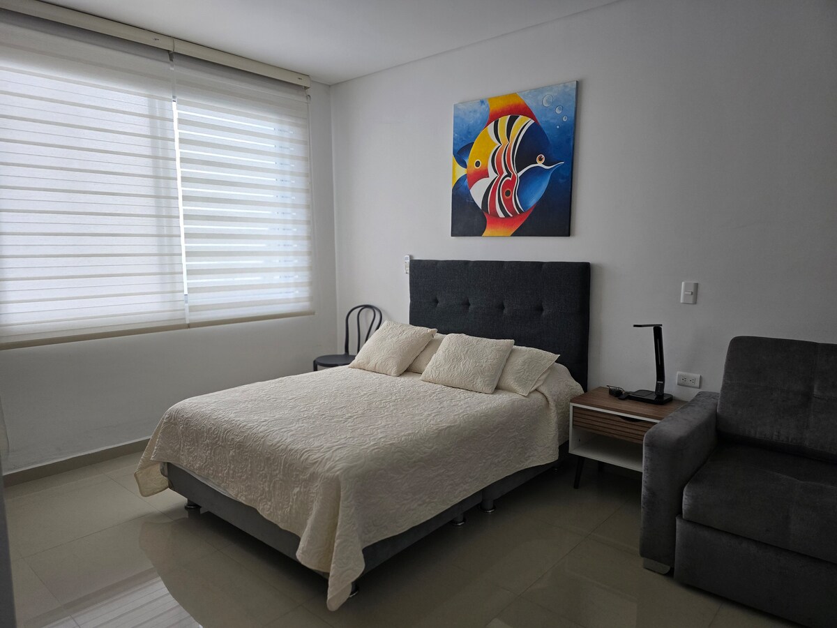 Njóttu þægilegrar og afslappandi dvalar í þessari notalegu íbúð sem staðsett er í rólegu íbúðarhverfi í Cali. Hún er fullkomin fyrir allt að fjóra gesti og er með tveimur loftkældum svefnherbergjum til að tryggja notalega og þægilega upplifun. Auk þess er boðið upp á einkabílastæði í íbúðinni sem veitir aukin þægindi og öryggi meðan á dvölinni stendur. Tilvalinn staður til að slaka á og skoða borgina með algjörri hugarró.