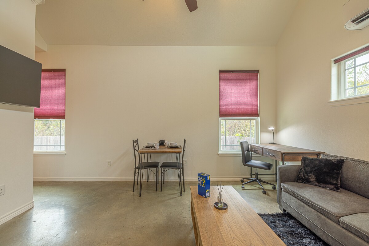 Welcome to our cozy studio apartment with its own private entrance, nestled alongside our home for your seclusion and convenience. It features a king-size bed for a peaceful sleep, a fully-equipped kitchen, and a comfy couch with TV for relaxation. Enjoy meals at the dining table and use the desk for work needs. Ideal for both leisure and business stays, our studio combines comfort with essential amenities to ensure a delightful visit.
