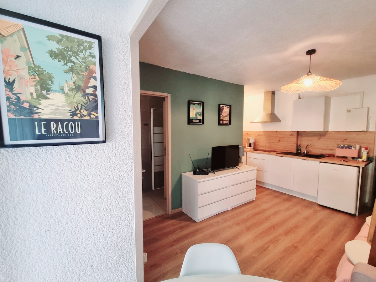 Komdu og njóttu kyrrðarinnar í þessari loftkældu og sjálfstæðu íbúð, friðsæl í hjarta gamla þorpsins Argeles sur mer og endurnýjuð að fullu árið 2022. Rólegt en nálægt þorpinu, þú getur verið sem par, eða 4 þökk sé svefnsófanum í stofunni og notið veröndarinnar með útsýni yfir ána og náttúruna. Aðgangur að ströndum er 5 mínútur með bíl, 30 mínútur á fæti, það eru skutlur og rafmagnshjól allt árið um kring, frekari upplýsingar um daqui-mobility .fr.