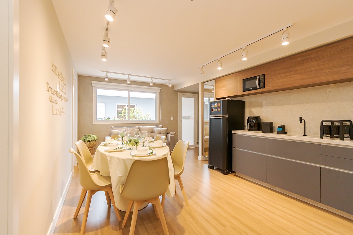 Relaxe neste espaço calmo e cheio de estilo. 🍃 Vaga de garagem exclusiva. Nosso processo de check-in é totalmente digital Localizado à 200m da Linha Verde Norte, próximo ao centro gastronômico Cadore, parque Bacacheri, Cindacta/Aeroporto Bacacheri e Museu Egípcio. Garden do Studio excelente para seu pet. Venha conferir o lindo pôr do sol do rooftop! Roupa de cama e banho ☑️Wi-Fi ☑️TV 43" ☑️Fogão ☑️Geladeira ☑️Pratos, talheres, copos e utensílios para cozinha.