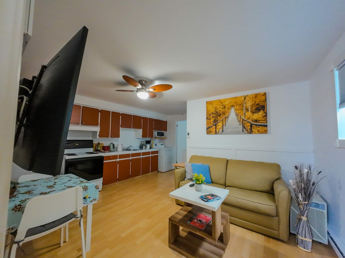 3 1/2 í hálfum kjallara með sérinngangi, stöðluðu bílastæði ( aðeins nauðsynlegt á veturna) og aðskildu herbergi. Þægileg staðsetning í 5 mín göngufjarlægð frá miðbænum og hjólastígnum í kringum Osisko-vatn. Fullbúið eldhús, þráðlaust net á miklum hraða, snyrtivörur og þvottahús á baðherberginu. Þægindaverslun er í 1 mínútu göngufjarlægð. Hægt er að fá fúton og rúmföt fyrir bilanaleit. Við hlökkum til að taka á móti þér!