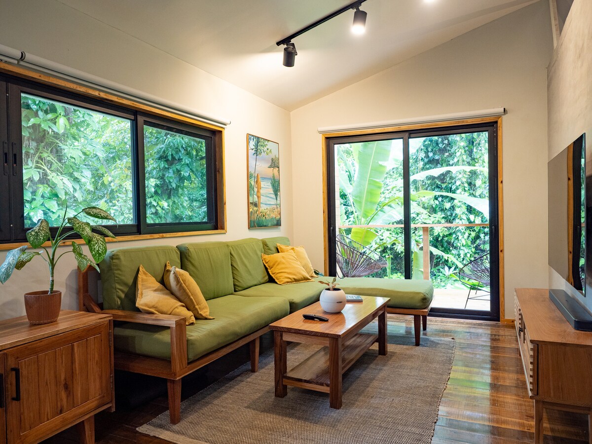 Þetta er í minna en 100 metra fjarlægð frá ströndinni og er frábær kostur fyrir litla hópa eða pör sem leita að rómantískum felustað. Með fullbúnu eldhúsi, borðstofu, skrifborði, svölum og stofu með sjónvarpi og Netflix líður þér eins og heima hjá þér í frumskóginum. Hjónaherbergið er með Queen 14" Wellsville Latex Hybrid dýnu, AC og loftviftu. 2. svefnherbergið er með fullbúnu rúmi og viftu í lofti. Queen-rúm er í risinu fyrir ofan með viftu á gólfi. Baðherbergið er staðsett á aðalhæð með regnvatnssturtu.
