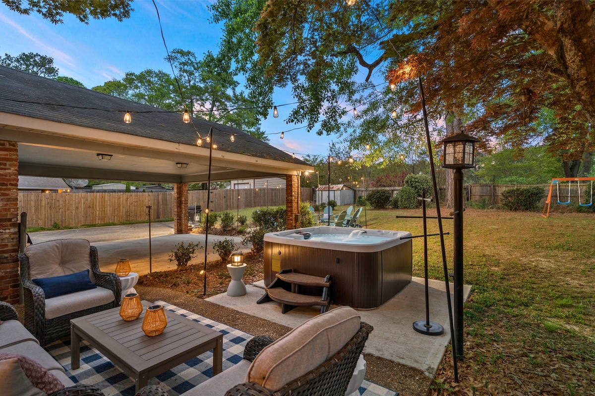 Welcome to The Ambassador — a luxury retreat sleeping up to 12 guests with exceptional amenities: 🧖♀️ Hot tub 🔥 Fire pit 🕹️Game room w/ arcade, shuffle board, foosball, pool, life-size chess and checkers 🍗 BBQ Grill 🏀 Basketball 📸 Insta-Worthy mural by local artist 📍15 min to Downtown and Ft. Benning & 5 min to CSU 🛏️ 4 bedrooms, 3 baths (2 bath tubs) 🛝Kids swingset 🧸 Family-friendly (play area, toys, books, bunk beds) 🎯 Outdoor games (corn hole, Jenga) 🚗 Parking for 3 cars