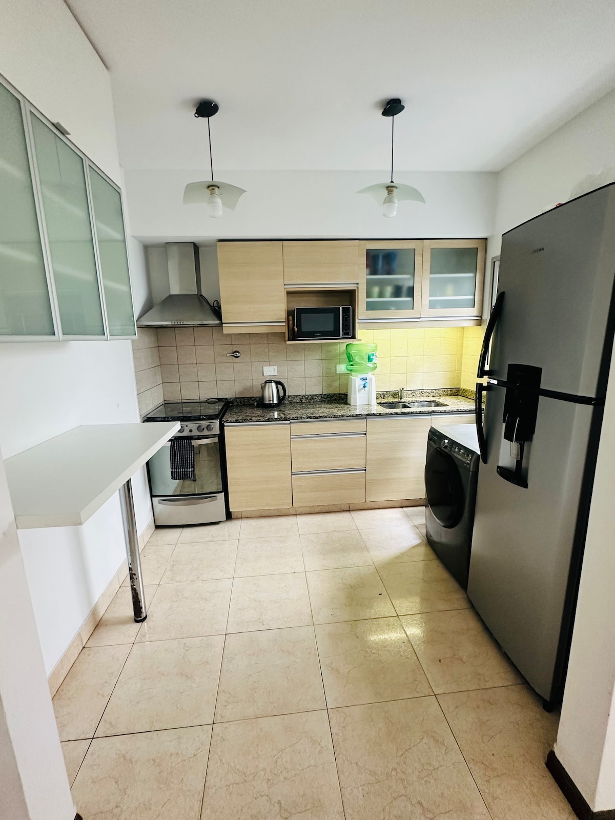 Relájate en este espacio tan tranquilo y elegante. Micro departamento funcional. 21 m2 Baño completo con bañera y mampara Cama de 2 plazas rebatible. Mesa de bar con 2 sillas. Microondas, horno eléctrico, pava eléctrica, cafetera tipo italiana , tostadora, anafe doble eléctrico, heladera con freezer. Cuenta también con plancha para ropa y secador de cabello. Máximo 2 huéspedes adultos.