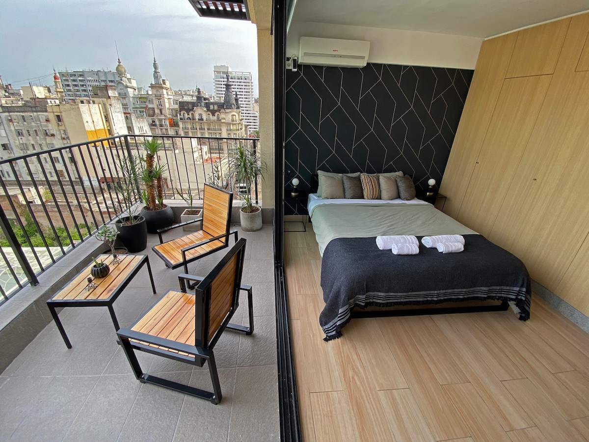 Staðsetning íbúðarinnar er tilvalin, aðeins nokkrum metrum frá hinu fræga Av Corrientes með veitingastöðum, börum og leikhúsum. Aðeins nokkrum mínútum frá Obelisk, Teatro Colón, Congreso, Recoleta o.s.frv. Síðan getur þú komið aftur og slakað á í þessu rólega og fágaða rými og notið útsýnisins yfir borgina og fengið þér drykk af rúmgóðum svölunum eða notalegan kvöldverð í borðstofunni. Ef þú ert að leita að þægilegri og þægilegri eign fyrir dvöl þína er þetta einstaklingsherbergi fullkominn valkostur. Við hlökkum til að sjá þig