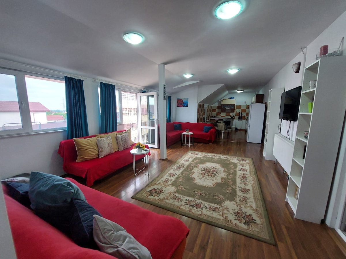 5 herbergja íbúð staðsett í aðeins 5 mínútna göngufjarlægð frá Seaside Alley, ströndinni, klúbbum, staðsett á háalofti Casa Adelina Guesthouse, str. Valhnetur, nr. 6. Í íbúðinni eru 4 tvíbreið svefnherbergi, 2 baðherbergi, rúmgóð stofa með 2 svefnsófum, fullbúnu eldhúsi og svölum með útsýni yfir sjóinn. Í íbúðinni er loftkæling í stofunni, 3 sjónvörp, þvottavél og uppþvottavél. Hægt er að nota garðinn og grillið í garðinum.