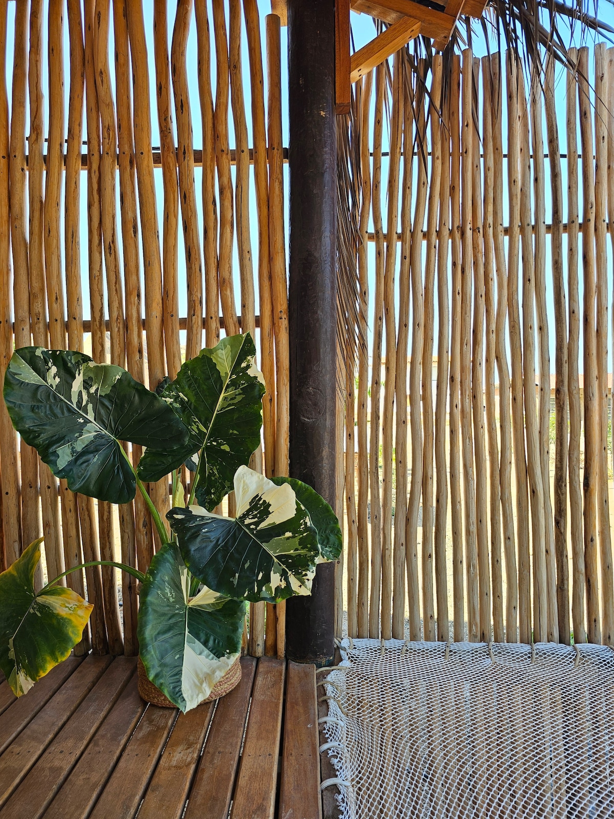 Fábrotnar skreytingar með staðbundnu efni. Fullkomið til að komast í burtu frá borginni og tengjast náttúrunni, varanlegri sólinni allt árið um kring og ströndinni. Bungalow heill með eldhúsi, stofu, 2 svefnherbergi, baðherbergi og verönd með útsýni yfir hafið, í fyrstu röð.