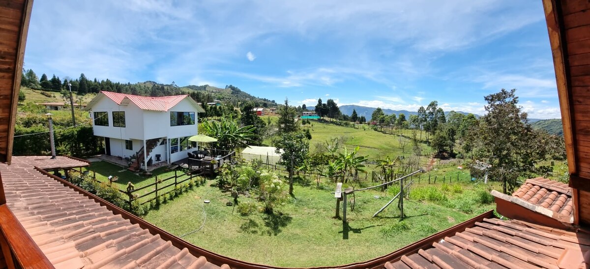 Slakaðu á með allri fjölskyldunni á þessum friðsæla afdrepi í Guarne, Antioquia, Kólumbíu — aðeins 15 mínútna fjarlægð frá MDE-flugvelli og 30 mínútna fjarlægð frá Medellín. Njóttu hestreiða í nágrenninu og líttu við í heillandi, sögulega bænum Guarne og bragðaðu staðbundna rétti. Af öryggisástæðum eru aðeins 8 öryggismyndavélar með beinni útsendingu fyrir utan eignina: Við aðalhliðið, framan við húsið, við innganginn (dyrabjöllu), við söluborðið, á hliðinni við bakgarðinn sem snýr að Maya Glamping og í bakgarðinum. Engar myndavélar eru fyrir innan.