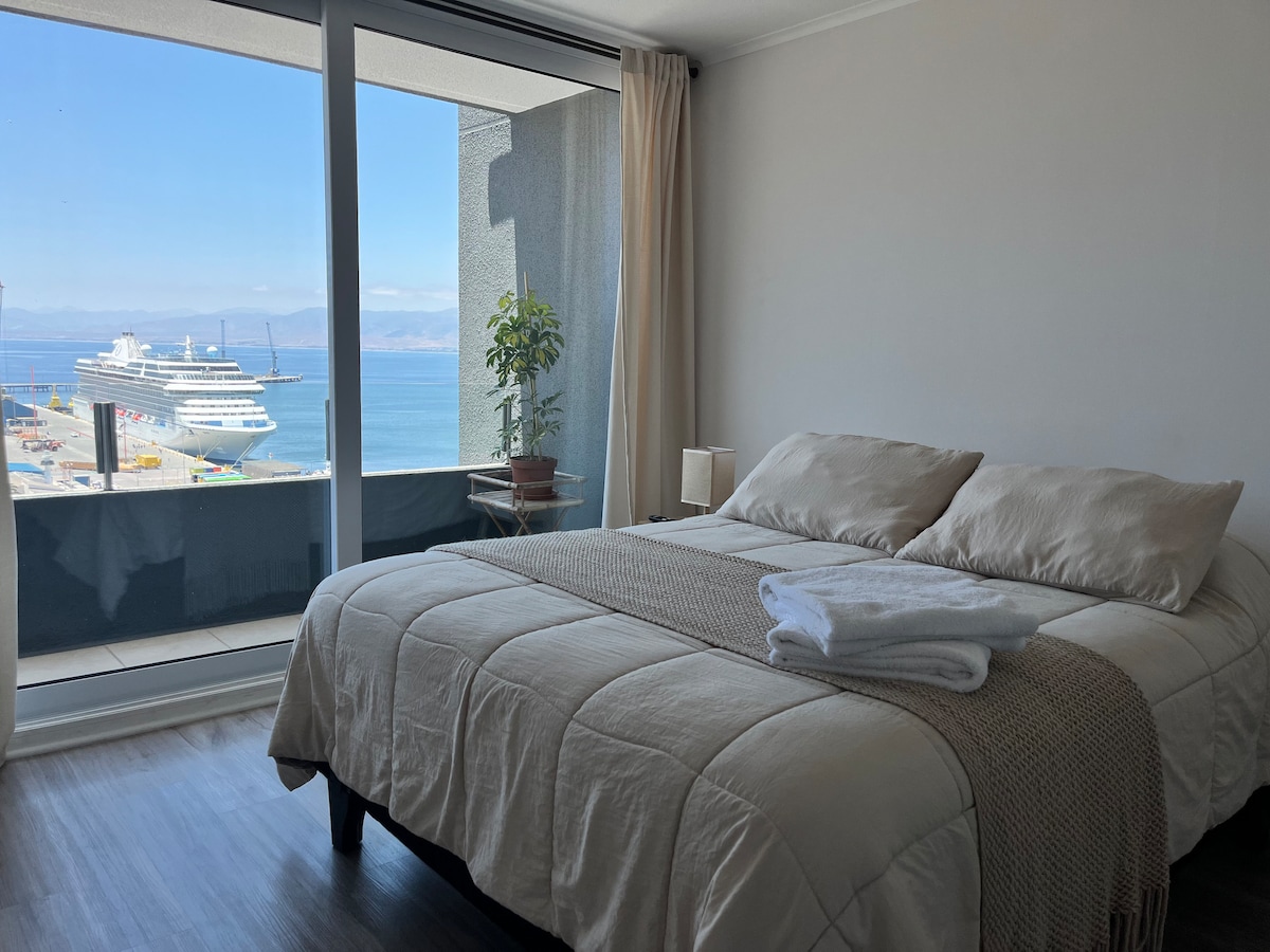 Despierta con una vista abierta a la bahía de Coquimbo, donde el mar y la luz marcan el inicio del día. Departamento moderno y acogedor, ideal para descansar o trabajar tranquilo, con check-in autónomo, WiFi rápido, Smart TV con Netflix y estacionamiento privado. Ubicado en pleno centro, a pasos del puerto, la Plaza de Armas y la playa, con excelente conexión hacia La Serena.