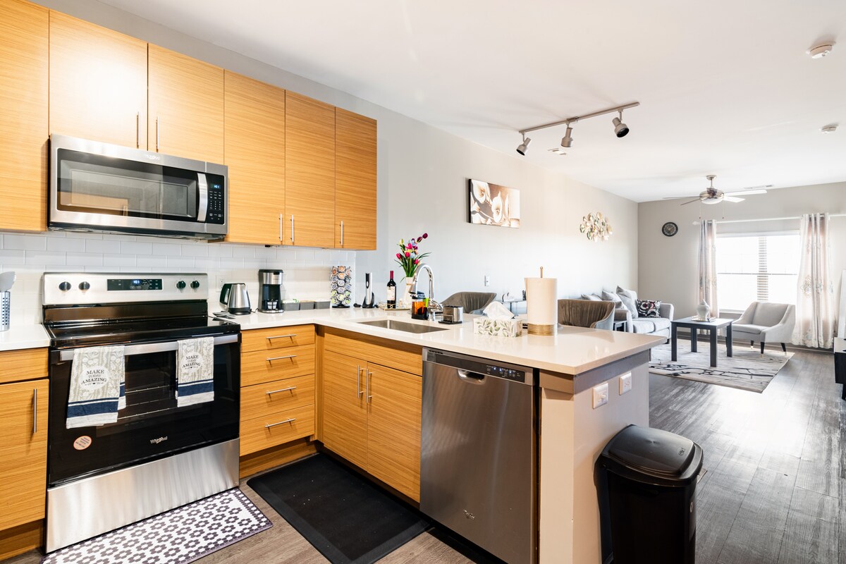 Upscale föruneyti m/King & Queen-size rúmum. Njóttu 750+ fermetra þægilegrar búsetu í NoDa hverfi nálægt Uptown Charlotte. Rétt hjá LÉTTLEST og þægilega staðsett í nokkurra mínútna fjarlægð frá bestu stöðum borgarinnar, matar- og verslunum og afþreyingu. Vinsæl staðsetning með stærstu vinnuveitendum og sjúkrahúsum svæðisins í nágrenninu. Allt sem þú þarft til að njóta dvalarinnar, fullbúið eldhús, grunneldunaráhöld, falleg tæki, háhraða þráðlaust net, útiverönd, líkamsrækt, sundlaug. Ókeypis bílastæði og auðvelt aðgengi að Uber/Lyft.