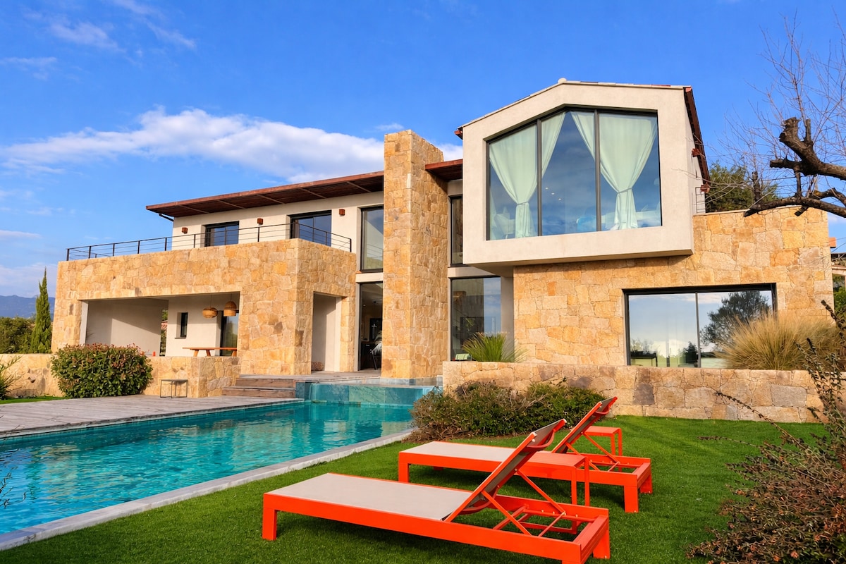 Húsið sem er 200 m2 er á rólegum stað en þó í 5 mínútna fjarlægð frá ströndum Bonifacio. Hannað til að taka á móti 4 fullorðnum og 4 börnum eða 6 fullorðnum og 2 börnum. Helsta eignin fyrir utan staðsetningu hennar eru fallega skipaðar útihurðir. Sumareldhúsið ,40m2,gerir þér kleift að búa úti frá morgunmat til kvöldverðar. Við höfum einnig tekið mikið á móti innanhússskreytingum sem gerir húsið nútímalegt og hlýtt á sama tíma. Sundlaugin sem er 15/4 m er upphituð. Einkaþjónn mögulegur .