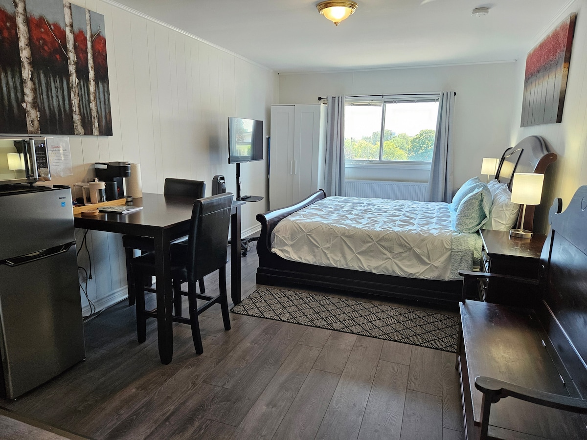 Einkastúdíó án beinna samskipta við gestgjafana. Um 15 mínútur frá Gatineau og 20 mínútur frá Ottawa með bíl. Þú hefur aðgang að heilsulind, gufubaði og kaldri setlaug gegn viðbótargjaldi (og háð framboði). Morgunmatur í nestisboxi er innifalinn. Fullkomið fyrir starfsfólk eða ferðamenn. Við erum með 2 hunda og kött (þau hafa ekki aðgang að stúdíóinu). Stúdíóið er sjálfstætt en samt tengt húsinu og við biðjum gesti um að halda viðeigandi hávaða meðan á dvölinni stendur.