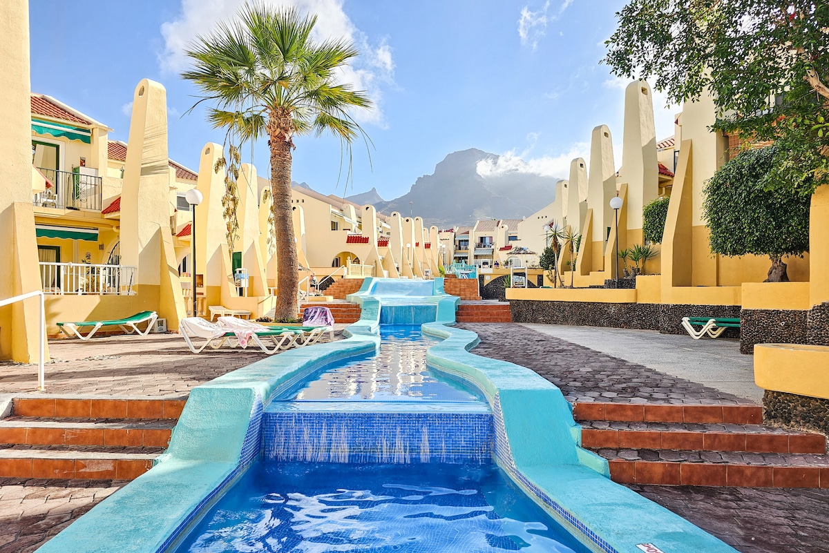 In a prime complex of famous Costa Adeje, next to the Beach, only 400m from Playa la Pinta, with 2 heated pools. Newly refurbished, 2 BDS, coastal designed 1-bedroom bungalow & spacious living-dining area, full kitchen, and a large, sunny terrace overlooking the heated pools with on-site pool bar. Plenty of restaurants, shops nearby next to the Shopping center. Ideal for up to 4 guests—All you need for a relaxing holiday! Fully equipped bungalow, free fast Wifi, epic public transport access.