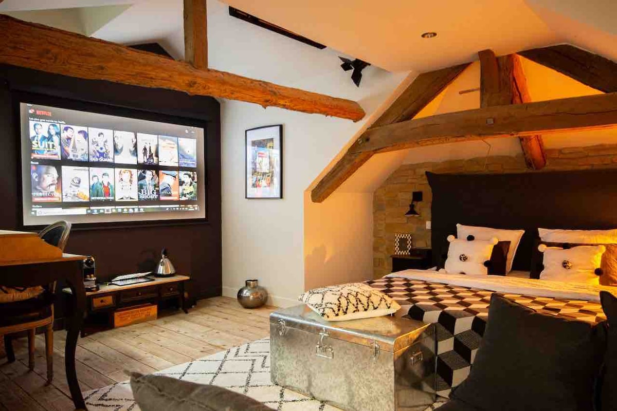 Ce loft avec sa vue sur rivière et sa grande suite à l'étage est unique. A 100m des fameuses Hospices, il possède une vue incroyable sur la seule rivière qui traverse le centre historique de Beaune. Il est situé sur une place très calme. Nous l'avons entièrement rénové et décoré en hommage au Cinéma et à Hermès. Il est très lumineux. Parking gratuit à proximité immédiate, restaurants et commerces. Une grande suite à l'étage avec climatisation. Tout équipé et arrivée 24/24