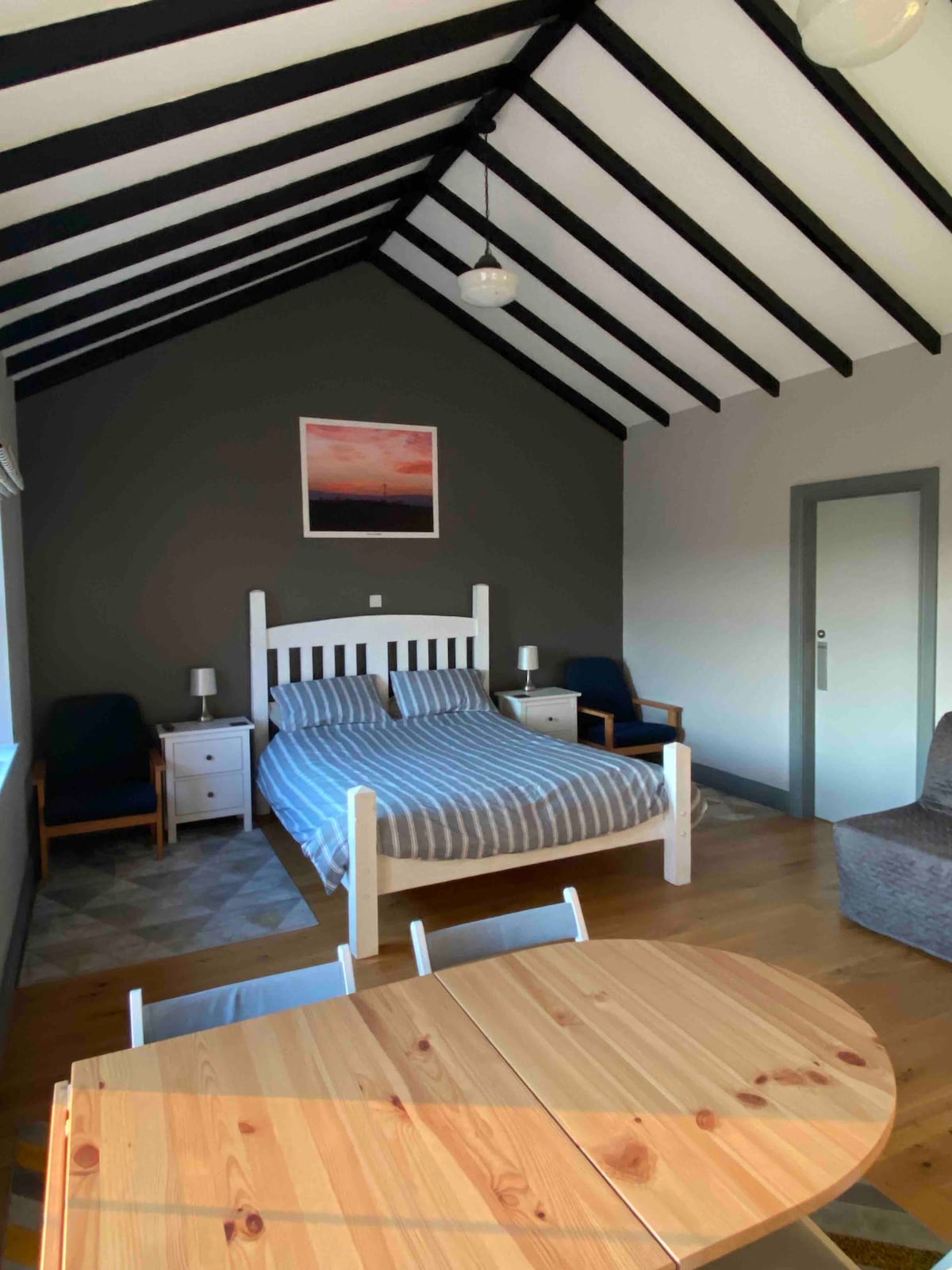 Töfrandi sveitasetur. 15-20 mín frá stórbrotinni norðurströndinni. Glæný stúdíóíbúð á efri hæð á einkabraut með töfrandi útsýni yfir Bann-dalinn með ýmsum gönguferðum um landið. Aðskilið aðgengi og úti rými með úti borðstofu og grilli Nútímaleg opin og skipulögð innrétting með aðskildum sturtuklefa og salerni. King size rúm og tvöfaldur svefnsófi svo mögulegt er fyrir 3-4 gesti. eldhúskrókur með örbylgjuofni, brauðrist og katli. Færanleg helluborð í boði sé þess óskað.