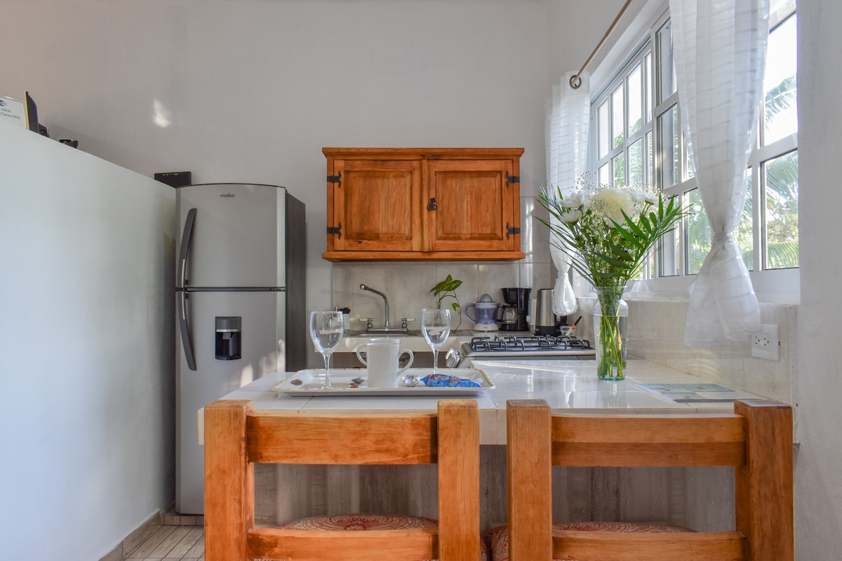Fullkomið fyrir strand- og náttúruunnendur í leit að rólegu fríi! Einn af bestu einkastöðunum á eyjunni, með beinan aðgang að sandströnd þar sem þú getur notið vatnaíþrótta eða einfaldlega slakað á við ströndina. Aðeins 5 mínútna akstur frá miðbæ Cozumel. Þessi nýlega uppgerða svíta er með allt sem þú þarft fyrir þægilega dvöl, þar á meðal: opna útiverönd, stórt stúdíó, sérbaðherbergi, loftkælingu, snjallsjónvarp, þráðlaust net og eldhúskrók með nýjum tækjum.