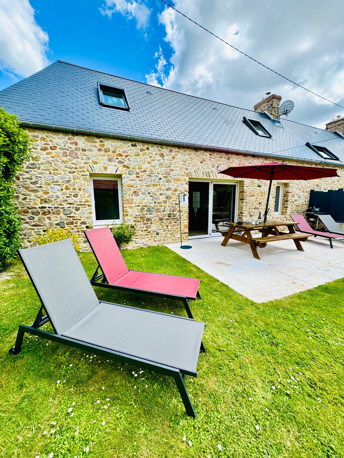 Þetta nýlega 90 m2 hús með öllum þægindum á 1000 m2 lokuðu lóði býður þig velkominn til Créances, nálægt ströndinni. Mjög bjart hús með 33 m2 stofu og fullbúnu, nútímalegu eldhúsi sem opnar út í stofuna. Þráðlaust net og sjónvarp. Öll 3 svefnherbergin eru búin þægilegum og nýjum rúmfötum. Baðherbergi með sturtu, 2 vöskum og salerni. Í garðinum er petanque-völlur til að skemmta þér, sólstólar, garðhúsgögn og grill til að skemmta þér.