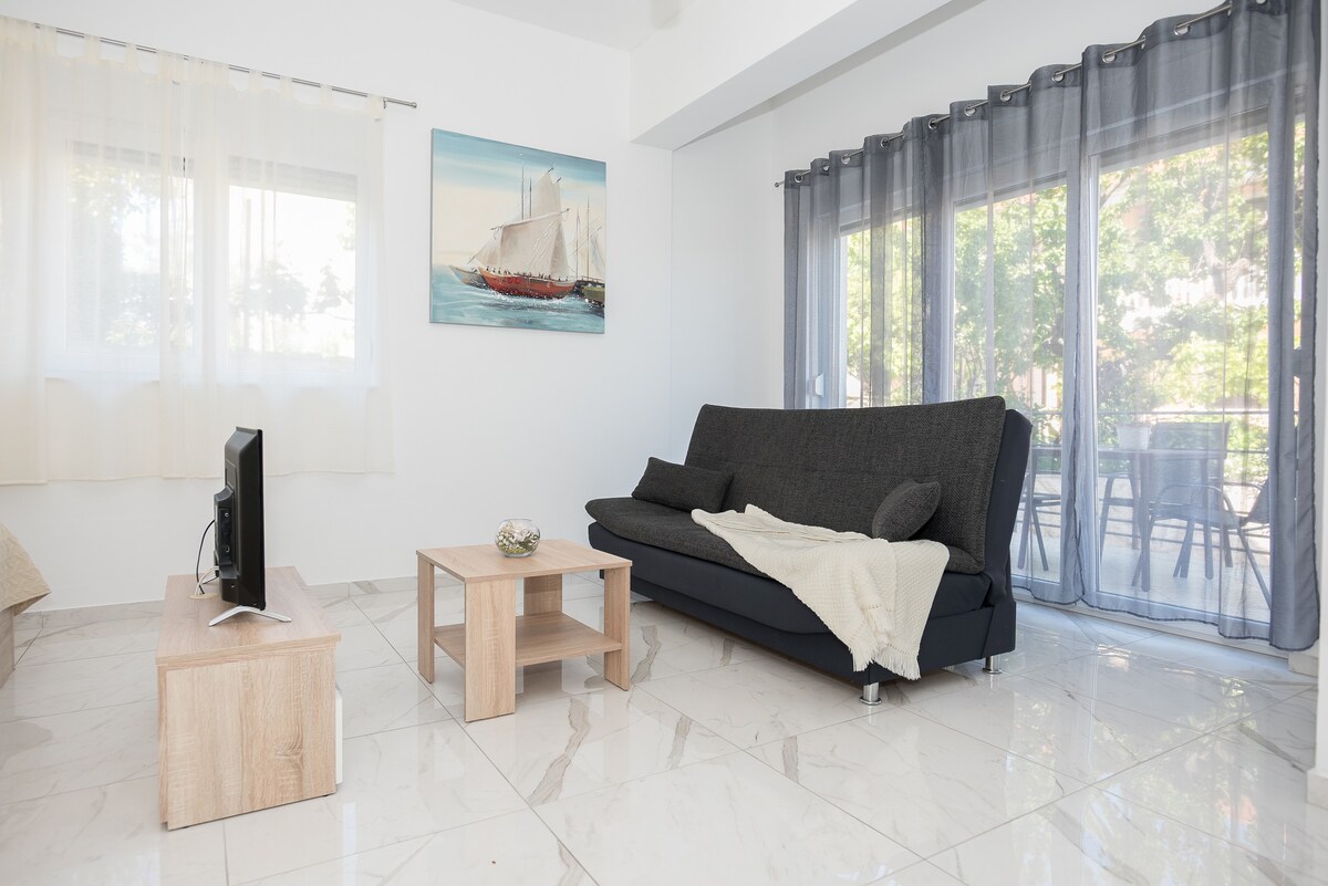 Lúxus íbúð með 1 svefnherbergi og sameiginlegri setustofu í garðinum. Staðsett í garðinum Vruljica, gott og íbúðarhverfi Zadar, aðeins 10 mín göngufjarlægð frá forna gamla miðbænum. Lúxus baðherbergi og mjög þægilegt rúm mun gera dvöl þína eftirminnilega. KÍKTU Á NOTANDALÝSINGUNA MÍNA FYRIR FLEIRI SKRÁNINGAR Í ZADAR!