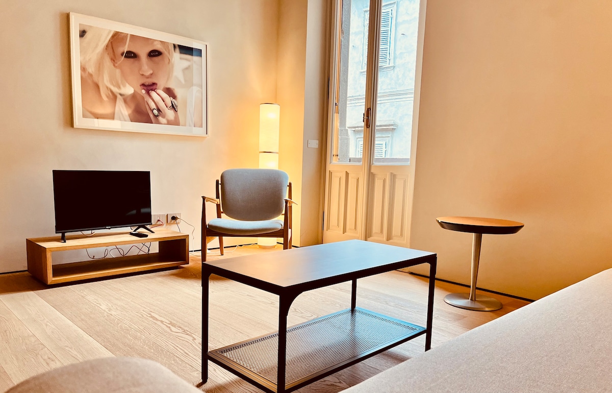 Appartamento imperiale dal design elegante con affreschi originali, le due maestose finestre offrono una vista spettacolare sul celebre Palazzo San Giorgio. L’appartamento si distingue per la sua raffinatezza e per il carattere unico dato dal soppalco, che ospita la zona notte. Le scale che conducono al soppalco sono adornate da affreschi storici ed antiche travi in legno a vista, immergendo l’ospite tra arte e storia.