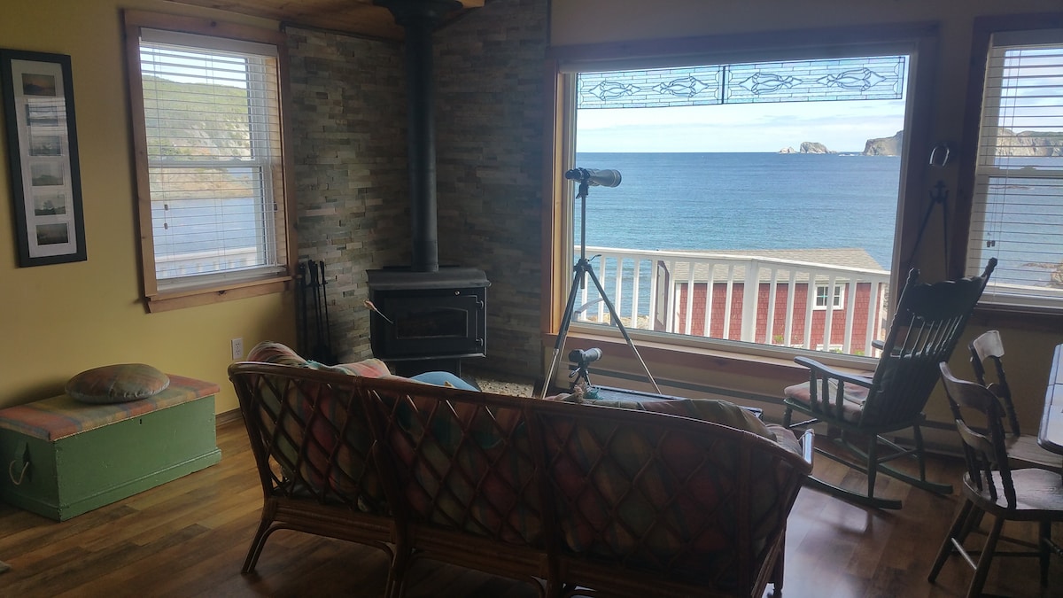 Front row seats to "Iceberg Alley"! View the bergs from the deck with a glass of wine, or from beside the fire from the giant picture window. Enjoy our beautiful cottage and ocean view deck. Comes complete with Air conditioning/heatpump, 1 Queen bed, 1 Twin futon in living room. The house is fully furnished, linens, High speed Internet, Apple TV and local phone included. There are ocean view windows everywhere! Min 2 night booking. Please read the house manual for entry instructions.