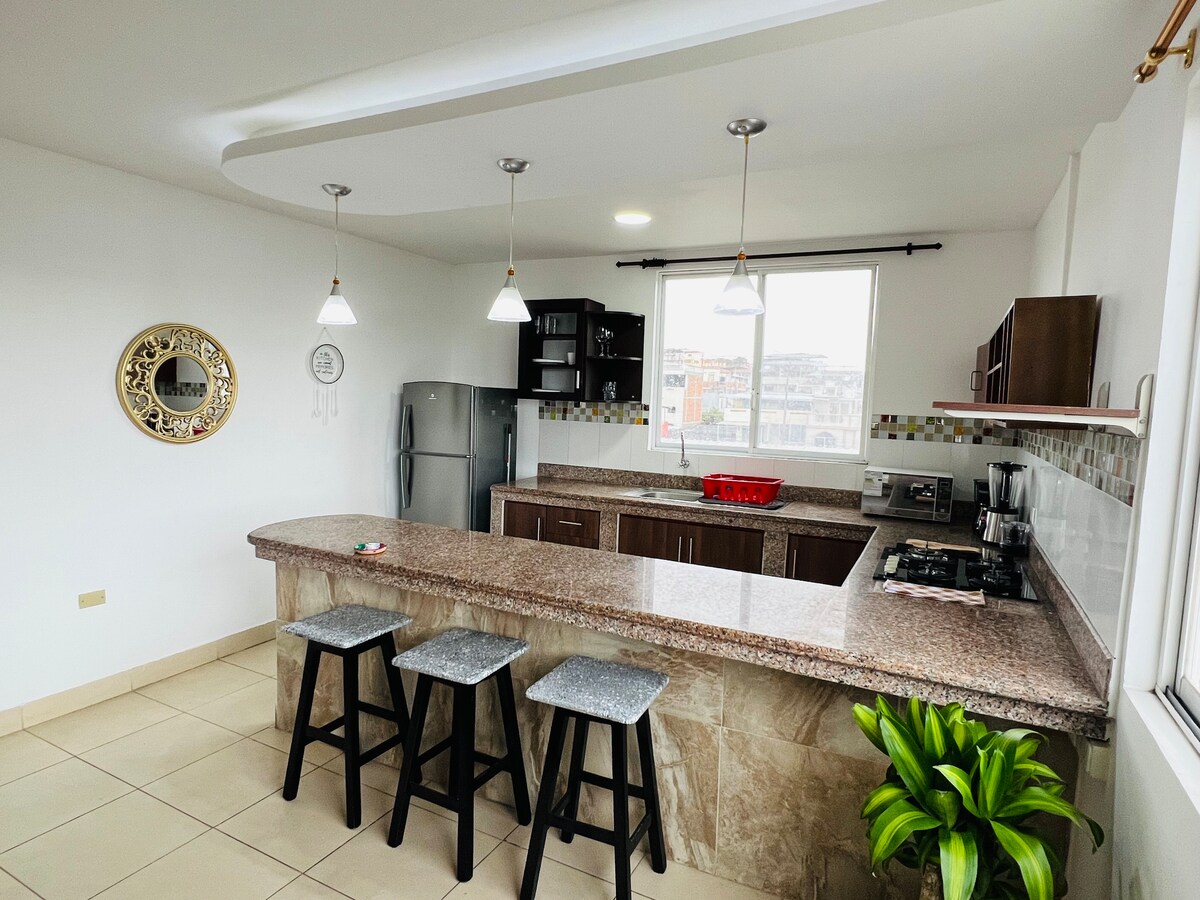 Falleg íbúð nálægt öllu! Mall del Pacífico, veitingastaðir, næturklúbbar og Playa Murciélago; forréttindastaður fyrir að vera mjög viðskiptalegur, commissaros, apótek og svo framvegis. Þægilegt, öruggt, einkagrill með litlu anddyri og nuddpotti þeir gera heimilið okkar besta fyrir ferðamenn og ferðamenn sem vilja hvíla sig eða njóta alls þess sem fallega borgin okkar hefur upp á að bjóða. (Ekkert veisluhald)