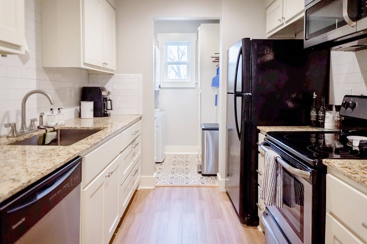 Verið velkomin í einkarekna 1000 fermetra 2ja herbergja íbúð okkar í miðborg Bentonville! - Vatnssía og mýkingarefni í heilu húsi tryggir drykkjarhæft vatn úr öllum krönum og sturtum. - Íbúð á 1. hæð, 10 feta loft, 2 king-size rúm, 1 stofa með 75’ sjónvarpi, 1 fullbúið baðherbergi og þvottahús. Yfirbyggð sæti á verönd. - Fullbúið eldhús (enginn ofn) og Jura kaffivél. - 1 mín. göngufjarlægð frá hjólastígnum, 5 mín. göngufjarlægð frá The Momentary og þremur kaffihúsum á staðnum, um 15 mín. göngufjarlægð frá miðbæjartorginu og veitingastöðum.