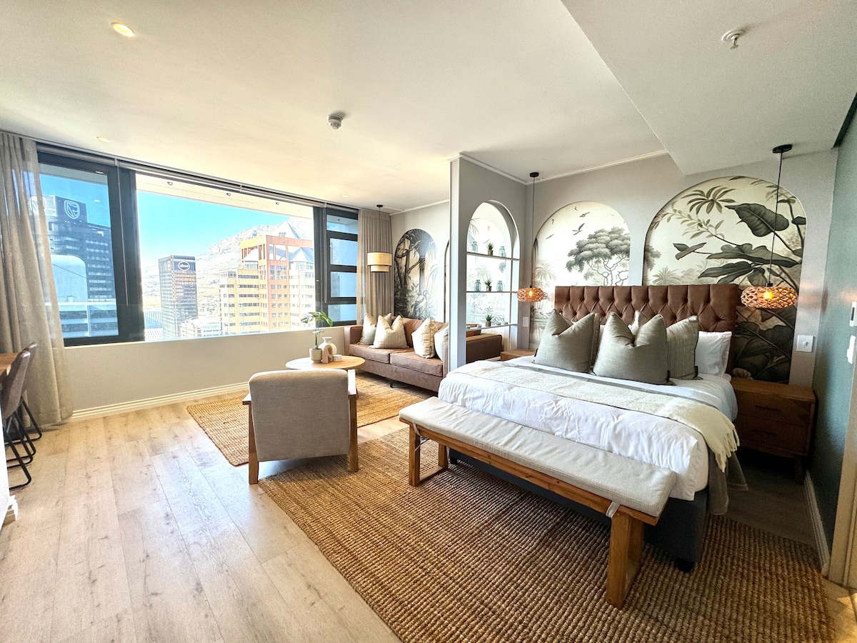 Verið velkomin í helgidóminn (útsýni yfir borðfjall) Litríkir fuglar og djúpir smaragðar sökkva þér þegar þú kemur inn í þetta gróðursæla rými. Búin besta líninu og fráganginum til að draga andann frá þér. Fullbúinn eldhúskrókur stendur þér til boða. Setustofan er fullkomin fyrir þægileg kvikmyndakvöld. Í þessu rými er fjölnota borðstofa/vinnustöð fyrir neðan 50" sjónvarpið (hratt og öruggt þráðlaust net) með svölum með útsýni yfir Table Mountain.