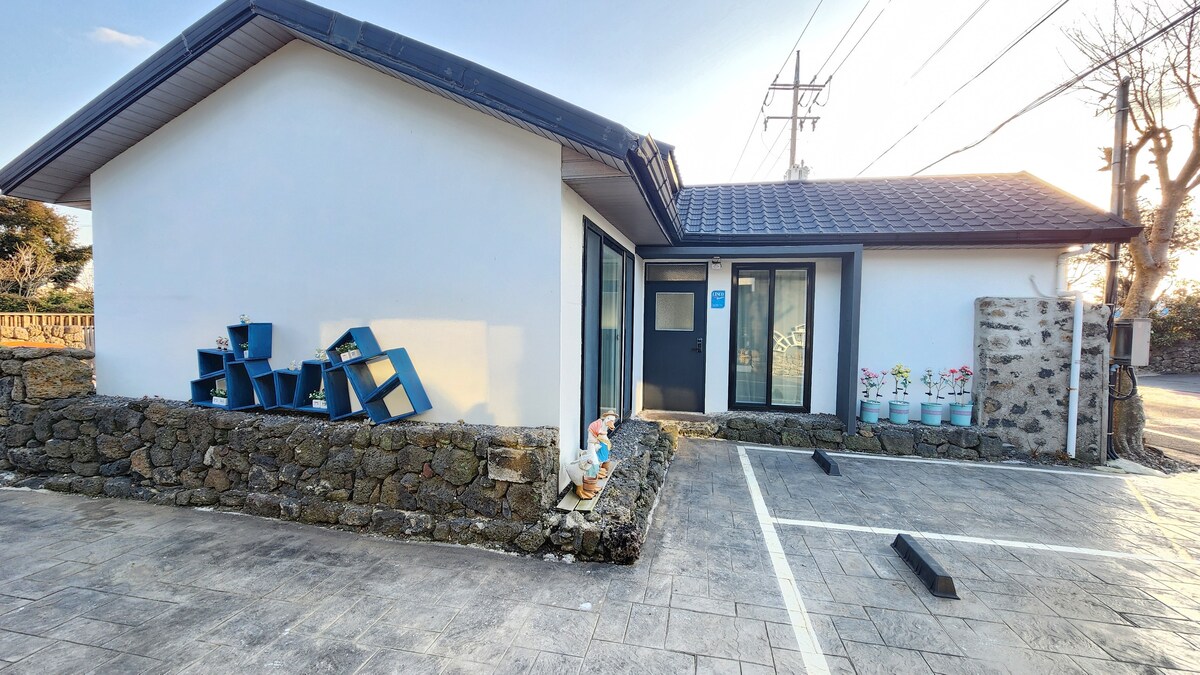 Ef þú ferð út á bíl í um 3 mínútur getur þú séð fallegt hafið í vesturhluta Jeju og séð stórfenglegt sólsetur meðfram Sinchang-strandveginum. Um 10 mínútur á bíl að Hyeopjae-strönd Nútímalistasafnið, Hwansang-skógur, Osulloc, 7 mínútur, Shinhwa History Park, Aviation Museum, 15 mínútur, Camellia Hill, International English School, Dorip Gotjawal, Alpafjall, Suwolbong, Jijil Trail, o.s.frv. og frábært útsýni yfir vesturströndina Þetta er útsýnið yfir sólsetrið. Njóttu stemningarinnar í sveitum Jeju á meðan heilun með stjörnunum. Gistiaðstaðan sem þú gistir í er einkaheimili. Það samanstendur af herbergi með queen-rúmi og litlu sjónvarpi, stofu/eldhúsi, og baðherbergi. Öll herbergi og stofa eru með vegghengi og loftræstingu og Þráðlaust net er einnig til staðar. Handklæði, sturtuþægindi, hárþurrka og öll nauðsynleg aðstaða er til staðar á ferðalaginu. Sjálfsafgreiðsla fyrir einfaldan mat og örbylgjuofn, ísskápur, innbyggð þvottavél. Það er skolskál á baðherberginu. Laust rými Gestir nota alla villuna.