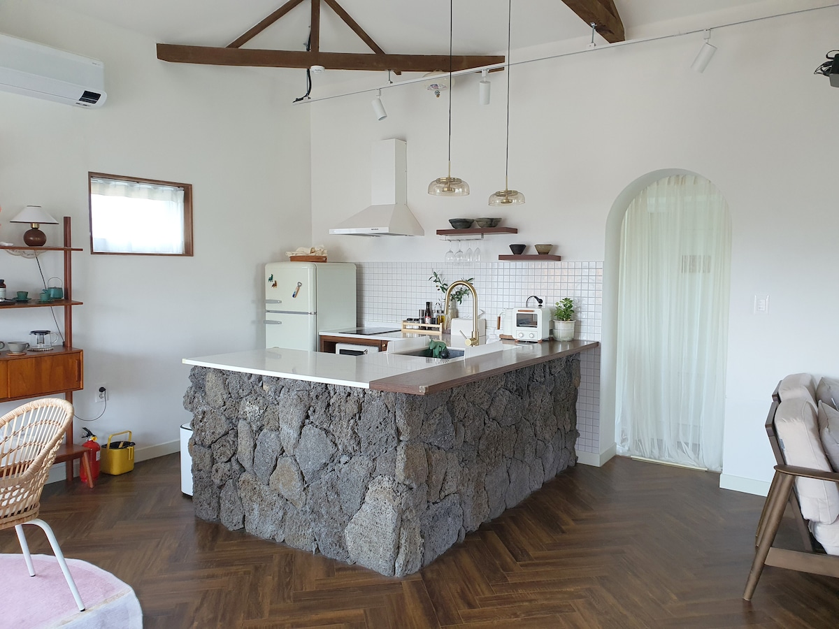 A modern take on traditional Jeju stone houses, Amongga is filled with emotion. The spacious yard and indoor kids' cafe delight families, while adults enjoy the cozy indoor BBQ and cafe-like main building. With sophisticated interiors and stone wall landscaping, it's perfect for families and romantic couples alike. Create unforgettable Jeju memories in this special space where eyes and hearts rest. Standard occupancy: 4, maximum: 6. (Please specify guest numbers when booking)