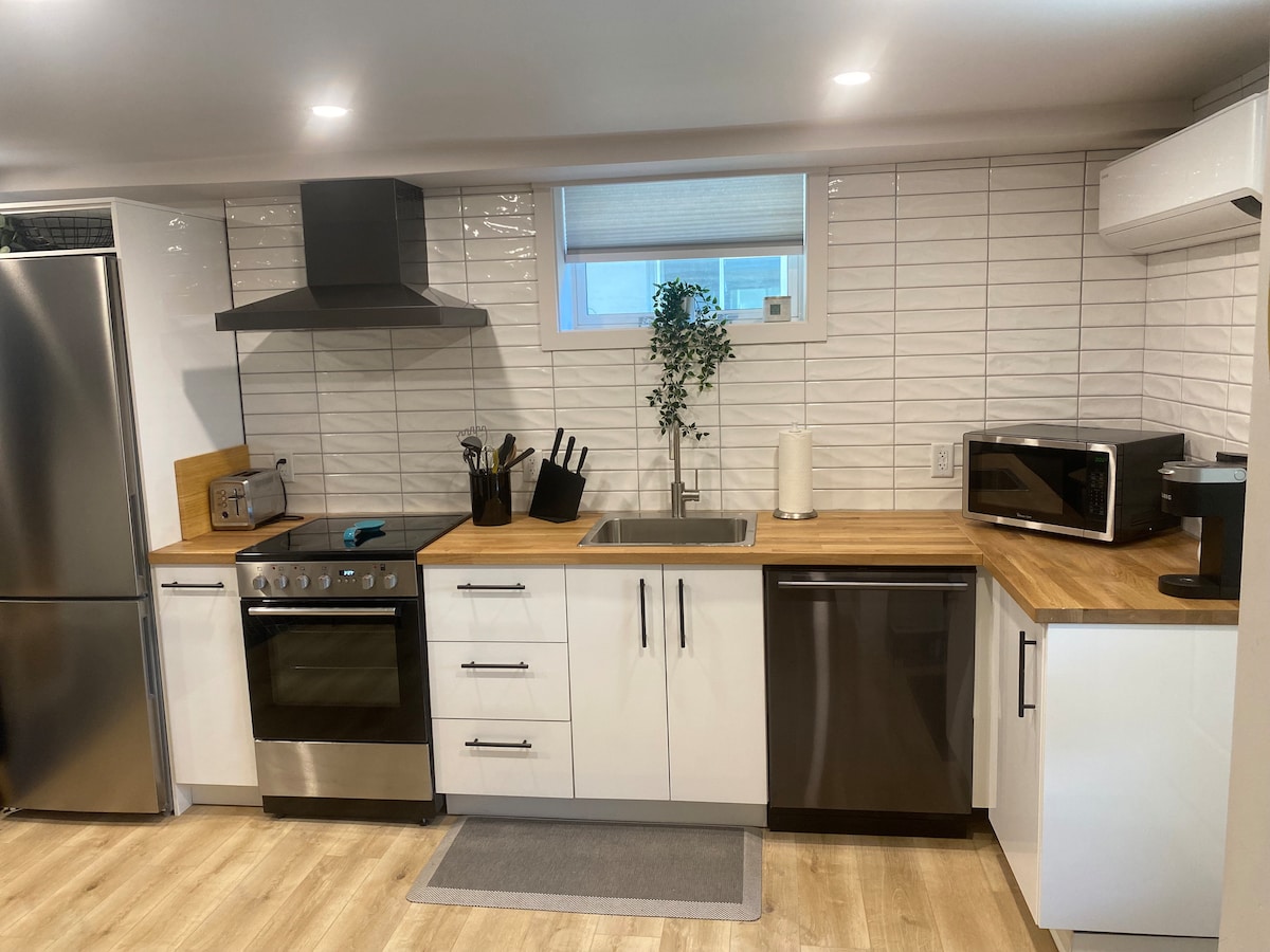 Njóttu glæsilegrar upplifunar í þessari miðlægu kjallarasvítu. Hönnuður lýkur í þessu 1 svefnherbergi og svefnsófa er tilvalinn fyrir lítinn hóp sem vill minni en hugulsaman stað nálægt miðbænum. Þessi garðsvíta er ekki með allt sem þú þarft fyrir þægilega dvöl: - fullbúið eldhús - rúmgott baðherbergi - stofa með 50"snjallsjónvarpi - þægilegt queen-rúm og frábær queen-sófi (þykk dýna) Besti hlutinn - hér eru ÓKEYPIS bílastæði.
