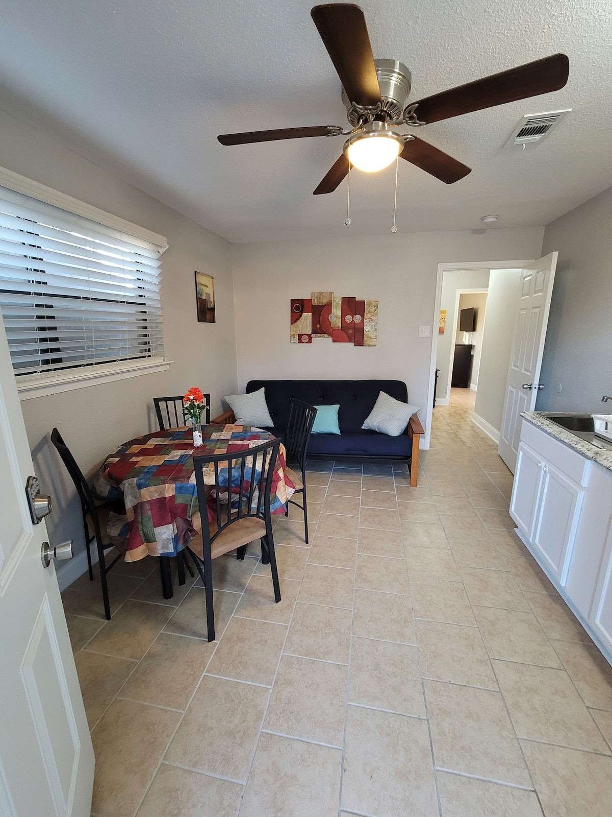 Rúmgóð, heillandi og friðsæl gestaíbúð við aðalhúsið fyrir einn með aðskilinni setustofu með eldhúskrók,þráðlausu neti og RokuTV. Stórt svefnherbergi með aðliggjandi baðherbergi. Tilvalið fyrir viðskiptaferðamenn eða persónulegt athvarf í öruggu og rólegu hverfi. Boðið er upp á sjálfsafgreiðslumorgunverð eins og kaffi/te og snarl. Sérinngangur með talnaborði og yfirbyggðu bílaplani. Miðsvæðis við DFW metroplex áhugaverða staði, í 15-20 mínútna fjarlægð frá miðbæ Dallas!