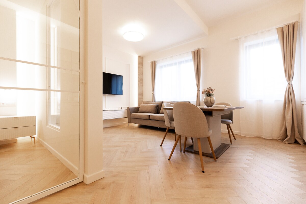 Stílhreina íbúðin okkar er tilvalinn staður fyrir ógleymanlegt borgarferðalag. Í íbúðinni er nútímaleg hönnun með 1 þægilegu svefnherbergi, rúmgóðri stofu og fullbúnu eldhúsi sem er tilvalið fyrir gesti sem kjósa að útbúa máltíðir heima hjá sér. Ókeypis þráðlaust net, snjallsjónvarp og loftkæling eru bara nokkur þægindi sem gera dvöl þína enn ánægjulegri. Til að auka þægindin er boðið upp á hágæða lín í íbúðinni.