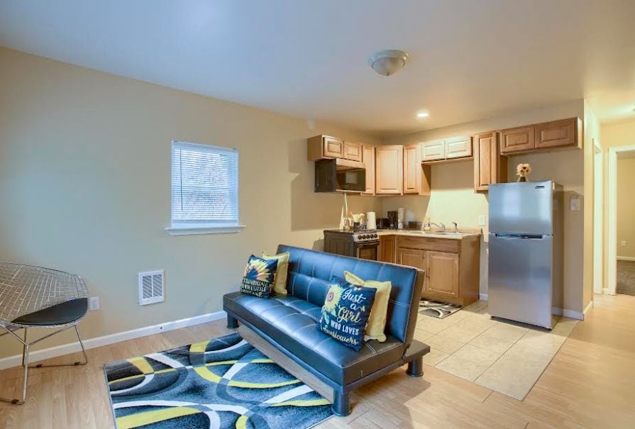 Friðsælt umhverfi bæjarins okkar mun umkringja þig með grænu! Þessi stílhreina, nútímalega bændahús íbúð býður upp á fullbúið eldhús, borðstofu og 65" flatskjásjónvarp. Svefnherbergið er með queen-size rúm með lökum, sólbleiktu hvítu og lyktar af fersku lofti utandyra. Leðursófi fjölskyldunnar í nágrenninu er tilbúinn til að breyta í queen-size rúm. Ríkulegt baðherbergi er með baðkari/ sturtu. Einkarými utandyra er við 1875 hlöðuhús með lítilli hænsnahópi sem gestir okkar virðast njóta.
