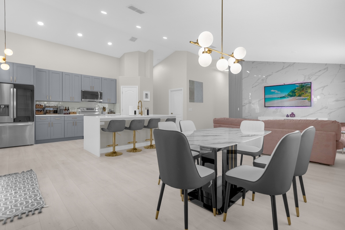 Verið velkomin í Villa Lumine, nútímalegan afdrep sem breytir lífi fólks, aðeins 20 mínútna akstursfjarlægð frá Disney! Njóttu rúmgóðra stofa, bóhemískrar setustofu og töfrandi kaffibar. Stígðu út í einkasundlaugina þína með ókeypis grillaraðstöðu. Hvert horn er hannað fyrir þægindi og stíl. Nálægt helstu stöðum, veitingastöðum og verslunum. Þessi villa er tilvalinn staður fyrir þig hvort sem þú ert í töfrandi Disney-fríi, fjölskylduferð eða afslappandi afdrepi! Sundlaugarhitari í boði gegn aukagjaldi, USD 40
