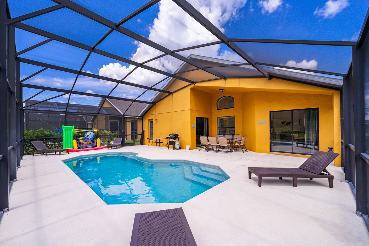 Komdu með alla fjölskylduna á þetta heimili í aflokuðum dvalarstaðarstíl með miklu plássi til að skemmta sér. Á heimilinu er einkaskimuð sundlaug með floti, hægindastólum, útiborðstofum og gasgrilli. Inni, 4 svefnherbergi með 6 rúmum, 3 baðherbergi, einkaskrifstofu og leikjum. Samfélagið býður upp á líkamsræktarstöð, 2 sundlaugar, leikvöll, 2 tennisvelli og 18 holu golfvöll. Aðeins 25 mínútur frá Disney World og 40 mínútur frá Universal Studios. Þægilegar samgöngur fyrir skemmtilegan dag á sumum af bestu ströndum Bandaríkjanna.