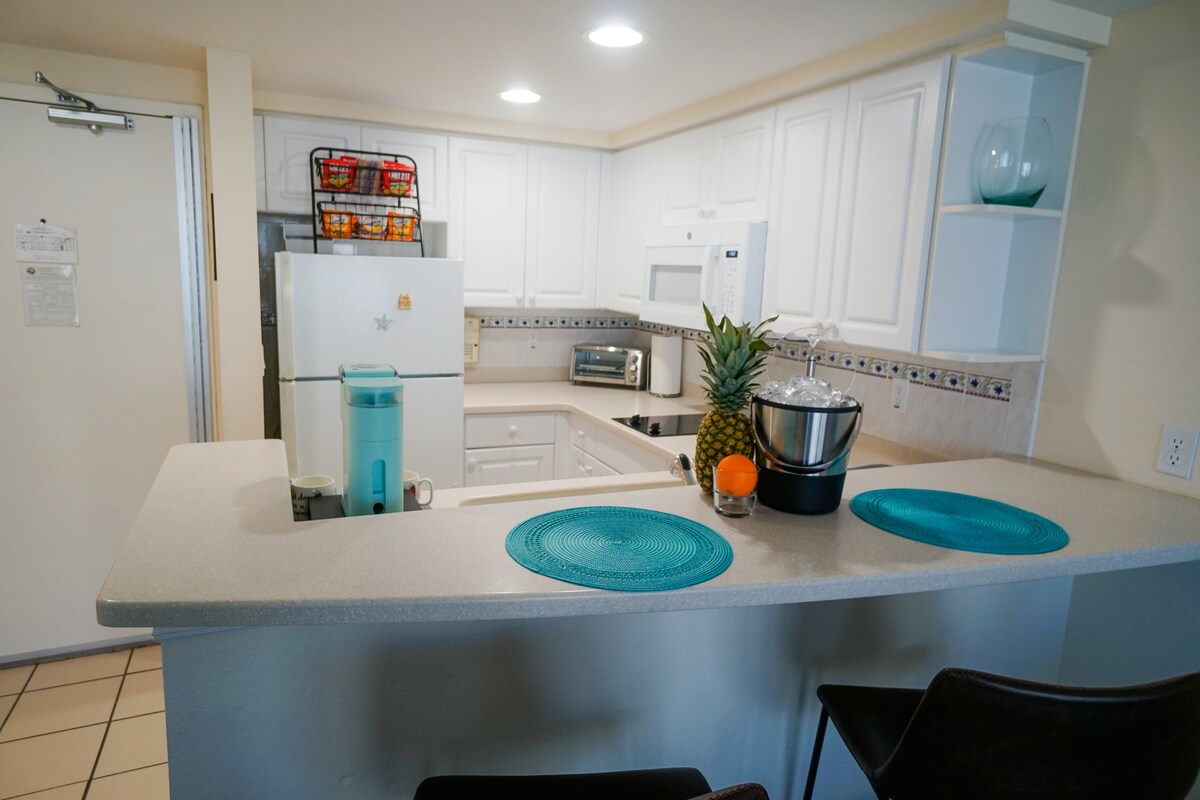 Rúmgott með frábært útsýni Gakktu að öllu! The Fountain Beach #402. Íbúðin er rúmgóð og einkarými fyrir rómantík, pör, fjölskyldu og vini. Tæplega 65 fermetrar á einu svefnherbergi með 2 queen-size rúmum, sérbaðherbergi með 2 manna nuddbaðkeri og sturtu, stór skjá, 2 einkasvölum. Aðskilin stofa með svefnsófa í queen-stærð, fullbúnu baðherbergi og einkasvölum. Stór sjónvarpsskjár, borðstofa með útsýni yfir hafið og fullbúið eldhús. Nýlegar uppfærslur fela í sér nýjan ísskáp, nýja teppi og nýja veröndarhúsgögn