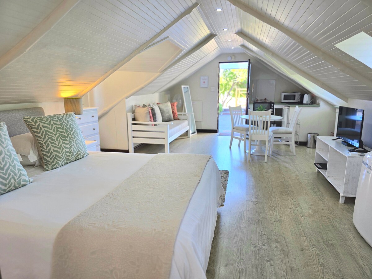 Slökktu á í stúdíóherberginu, afdrep í Hermanus með sérinngangi og stiga. Slakaðu á á sólríkri verönd með sólbekkjum, grillara og fjallaútsýni. Þetta opna rými blandar saman notalegum svefn-, borð- og eldhússvæðum en baðherbergið (baðker og sturtu) er einkarými með hurð. Njóttu nútímalegra þæginda eins og loftræstingar, þráðlausu nets, DSTV og Nespresso. Fullkomið fyrir pör sem vilja frið og næði. Engin börn yngri en 12 ára. Eldhúskrókur er með: Brauðrist, katli, smáofni með grill og ísskáp.