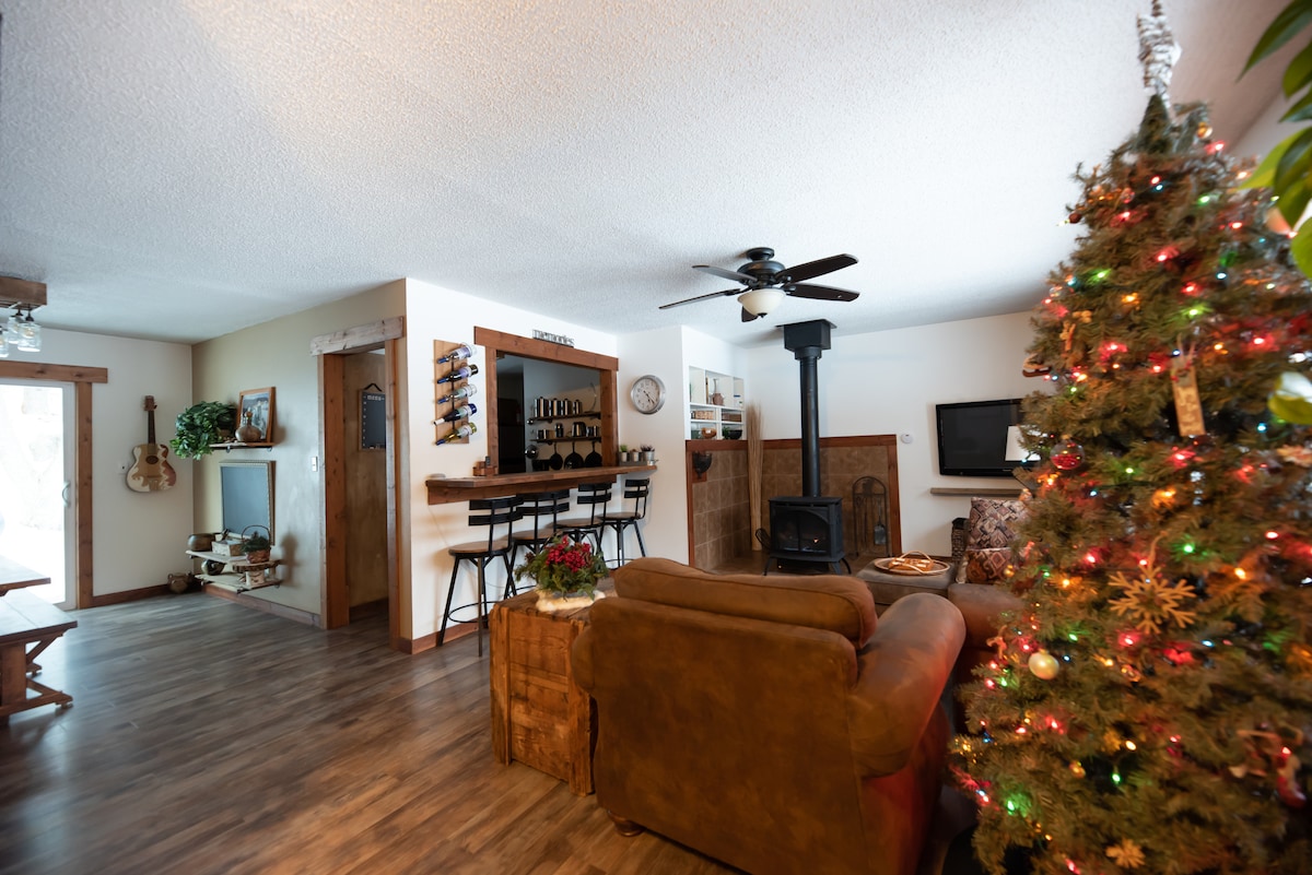 Þetta hlýlega heimili er staðsett við útjaðar bæjarins við College Drive og einkennist af sveitakofa en veitir þér skjótan aðgang að bænum. Landslagið í bakgarðinum er ekki bara fallegt heldur veitir það þér friðsælt afdrep frá bakdyrunum. Börn munu njóta hjólbarðaleiktækisins og teppisins en eldstæðið og tjörnin með gosbrunninum verða í uppáhaldi hjá fullorðnum í hópnum. Þrívíddarnuddstóllinn heldur þér fullkomlega afslappaðri meðan á dvölinni stendur.