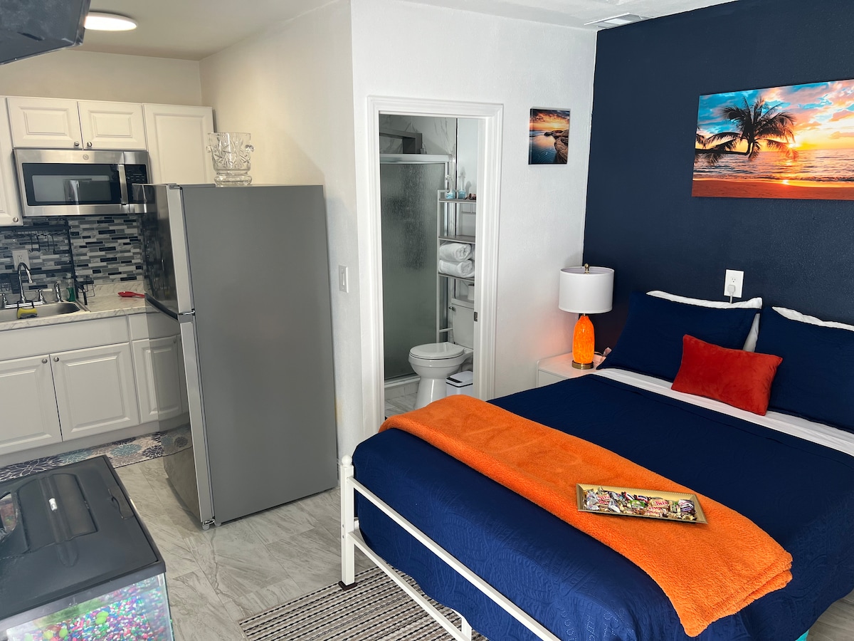 Vaknaðu við sólarljós sem strýkur inn um gluggana, ilmi af staðnum ristuðu kaffi í loftinu og fyrirheit um rólegan morgun í Flórída. Verið velkomin í Sólrísusvítuna — friðsælan griðastað þar sem sjarmi strandarinnar blandast nútímalegri hönnun. Þetta fallega enduruppgerða heimili í Punta Gorda var hannað fyrir þá sem sækjast eftir rými sem er bæði íburðarmikið og látlaust. Þú munt vera nálægt boutique-verslunum, veitingastöðum við vatnið og ströndum við Mexíkóflóa, aðeins tveimur mínútum frá I-75 og tíu mínútum frá miðbæ Punta Gorda.