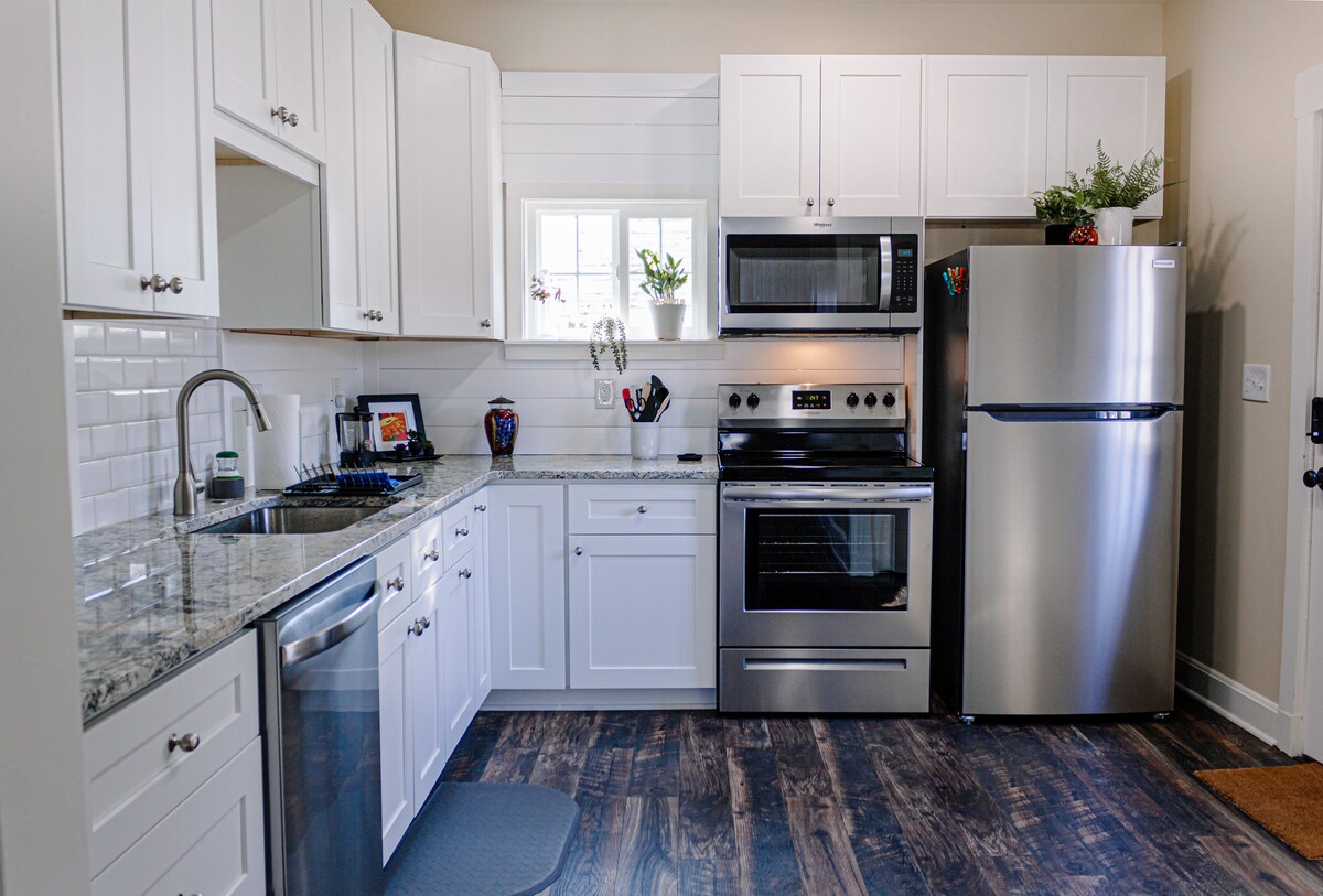 Endurnýjað 2 rúma/1 baðherbergi með king-rúmi. Gæludýr velkomin