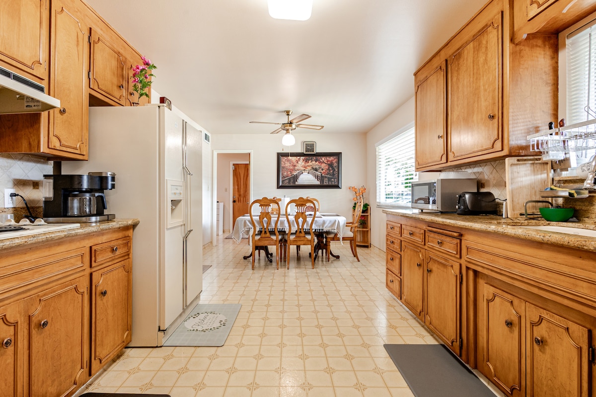 Þetta glaðlega og sólríka heimili er staðsett í rólegu og öruggu eldra hverfi nálægt miðbænum og þægilega ekki of langt frá Hwy 99. Heimilið er fullkominn og notalegur staður til að hvíla sig og slaka á. Litla svæðið okkar í Modesto er einstakt að því leyti að við erum með frábæra göngu- og hjólaleið í aðeins nokkurra húsaraða fjarlægð. Þú getur gengið að litla hverfisverslunarsvæðinu okkar þar sem er matvöruverslun með Starbucks, mjög vinsælli frosinni jógúrtverslun, veitingastöðum, sjálfstæðri bókabúð og sætum verslunum.