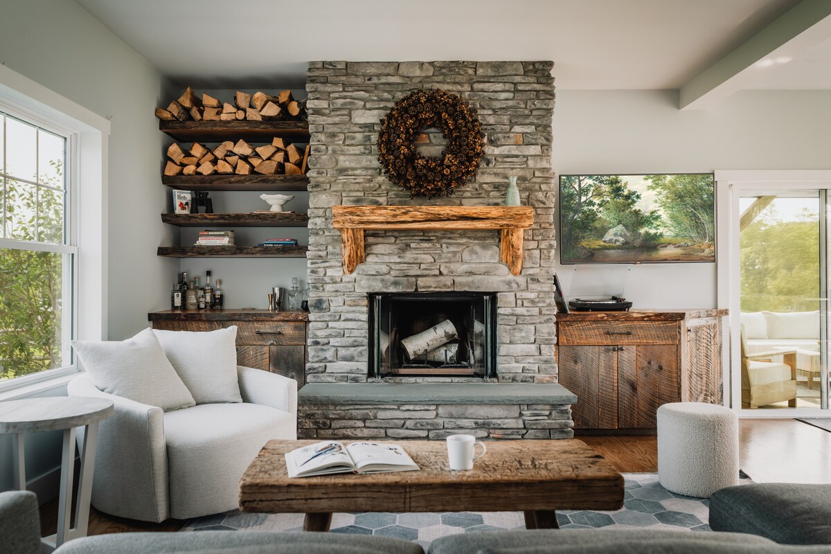 *New for 2026* Wellness upgrades and expanded living space: hot tub, fire pit, and finished lower level with media room, game room with king Murphy bed, gym with sauna, and full bath—will be ready by April 1. Follow updates on IG 'neversink retreat' Stunning private Catskills retreat on 15 acre hobby farm. Heated saltwater pool, indoor/outdoor fireplaces, screened porch, orchard, trails, creek, and gourmet kitchen. 3 fenced acres for dogs. Weekday rates vary. Book 7+ days and save 10% (except s