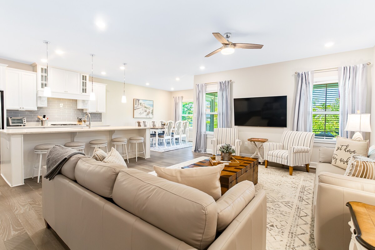 Welcome to our Cozy Beach House! This massive new construction 5 bedroom, 3 bathroom home can sleep 12 people with nearly 2200 sq ft of living space. This beautiful home is located in a quiet and charming neighborhood only 4 miles to the beach and only 1 mile from Tanger Outlets! We are close to so many delicious eating establishments- you'll have your pick of options! You'll enjoy full linen service, essential toiletries, a well-stocked kitchen, Smart TVs, and thoughtful beach amenities.