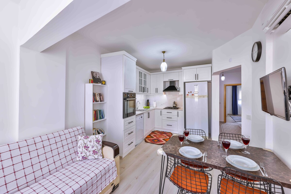 Þú getur gist í 1+1 lúxusíbúðum okkar með nýlegum húsgögnum. Þú getur gist fyrir 3 manns í burtu frá hávaðanum í borginni með útsýni yfir náttúruna. Við fylgjumst sérstaklega með reglum um hreinlæti og hollustuhætti. Við treystum því að þú munir elska fallegu íbúðirnar okkar jafn mikið og við gerum. Þú kemst fótgangandi að sjónum í 8 mínútur Þú getur notað almenningsströndina að kostnaðarlausu Þú getur séð það á myndunum okkar Market Restaurant Bakery Grocer Pastry Shop Butcher Þú færð aðgang að öllu sem þú þarft á 3 mínútum