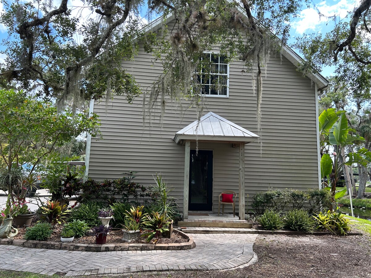Slakaðu á með fjölskyldu, vinum á þessum rólega stað. Komdu með bátinn þinn, veiðistangir eða rör, kajaka, hjól og marshmallows fyrir varðeldinn. Þetta gestahús í bílskúr er með friðsælt útsýni yfir vatnið, svefnherbergi, baðherbergi, þvottavél, þurrkara, fullbúið eldhús, 22" drottning og lítið futon. Komdu með bátinn þinn til fiskveiða, slöngur, steingervingaveiðar og skoðaðu þig um á Caloosahatchee. Leggðu bátnum í síkinu. Inni geymsla fyrir veiðistangir, tæklingar og hjól fyrir fjallahjólagarðinn hinum megin við ána. Hundar eru í lagi.
