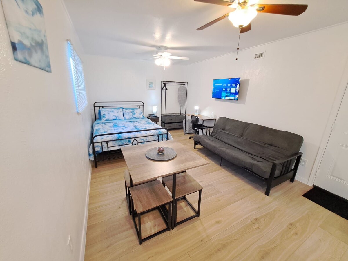 Njóttu einkasvítu með tveimur svefnherbergjum, engum tröppum og eigin inngangi í rólegu íbúðarhverfi. Slakaðu á í notalegri stofu með hröðu þráðlausu neti, snjallsjónvörpum í hverju herbergi, vinnusvæði og borði fyrir fjóra. Eldhúskrókurinn er með örbylgjuofni, ísskáp/frysti, vaski og grunnlegan disk en ekki eldavél eða ofn. Njóttu ókeypis kaffis og tandurhreinnar, þægilegrar gistingar á góðu verði.